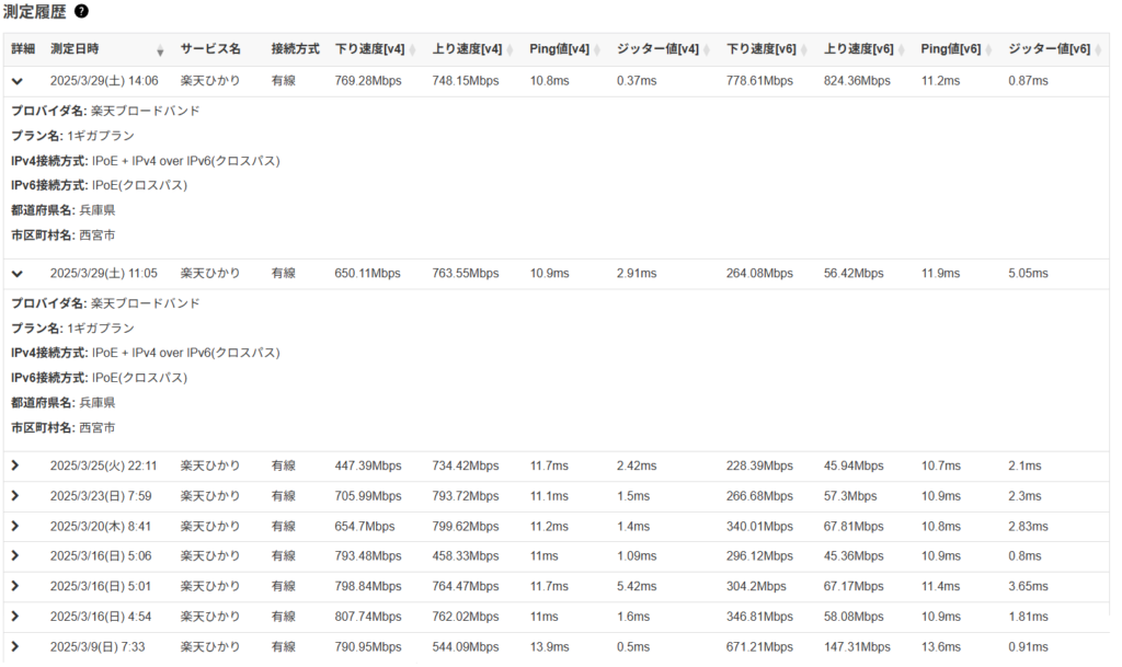 一応お送りはしようかなぁと思ってはいますが、ひとまず使えないということで、TP-LinkのAX73に戻してしまいました。その時の通信速度テストの結果が次の通りです。一番上がTP-LinkのAX73、その下からはバッファローのWSR-5400です。v4だと遜色ないのですが、v6だと明確に差が出ています。この辺が違いなのかな?