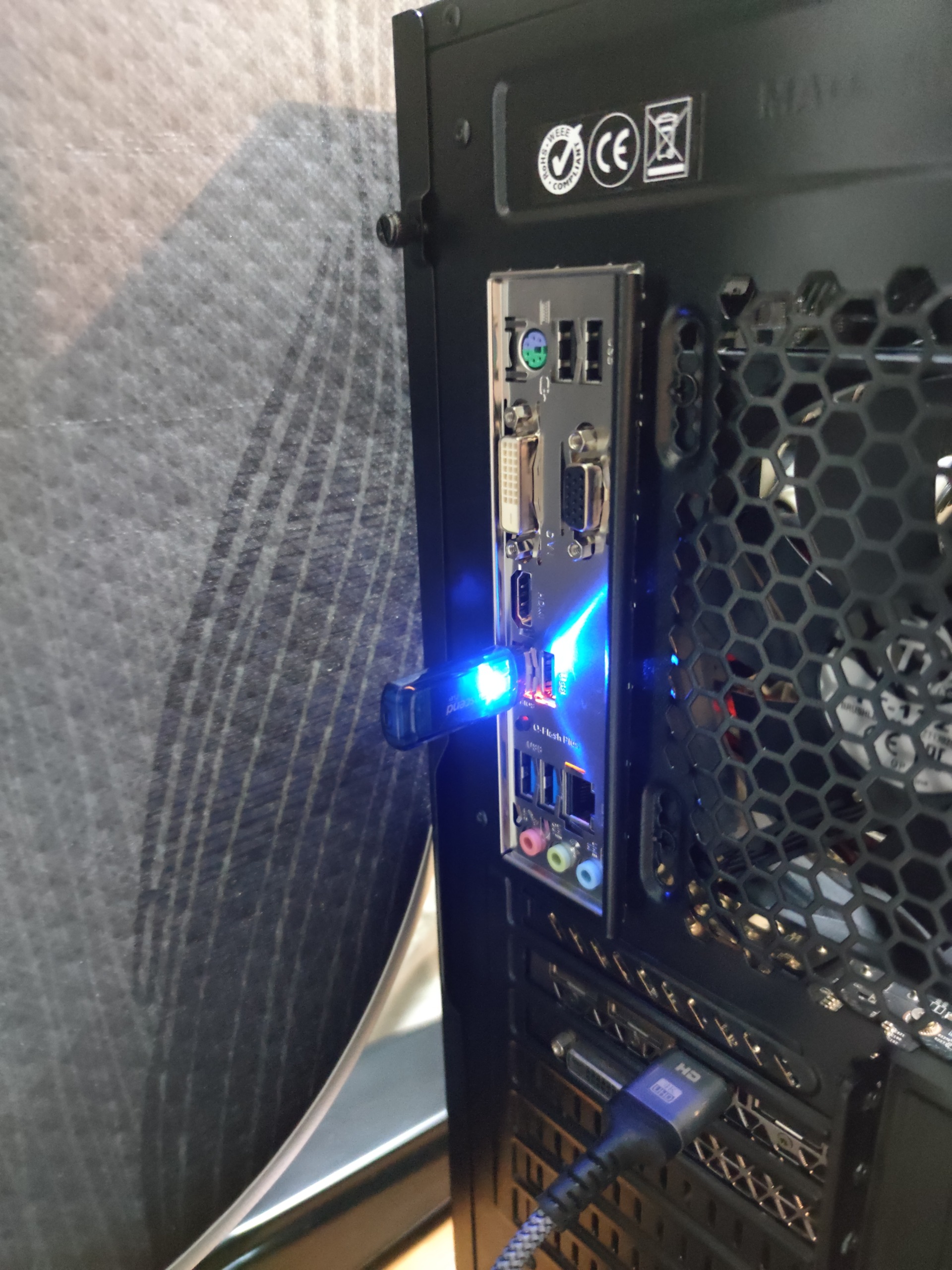 ボタンを押すと写真のように(わかりにくいですね・・・。)オレンジ色に点滅します。こうなればBIOSアップデートがスタートです。10分もかからないくらいで終わりますので、待ちましょう。アップデートが終わったら勝手にBIOSが立ち上がりますので、それまでの辛抱です。結構気になってしまうんですよね。私はずっと見てました・・・。